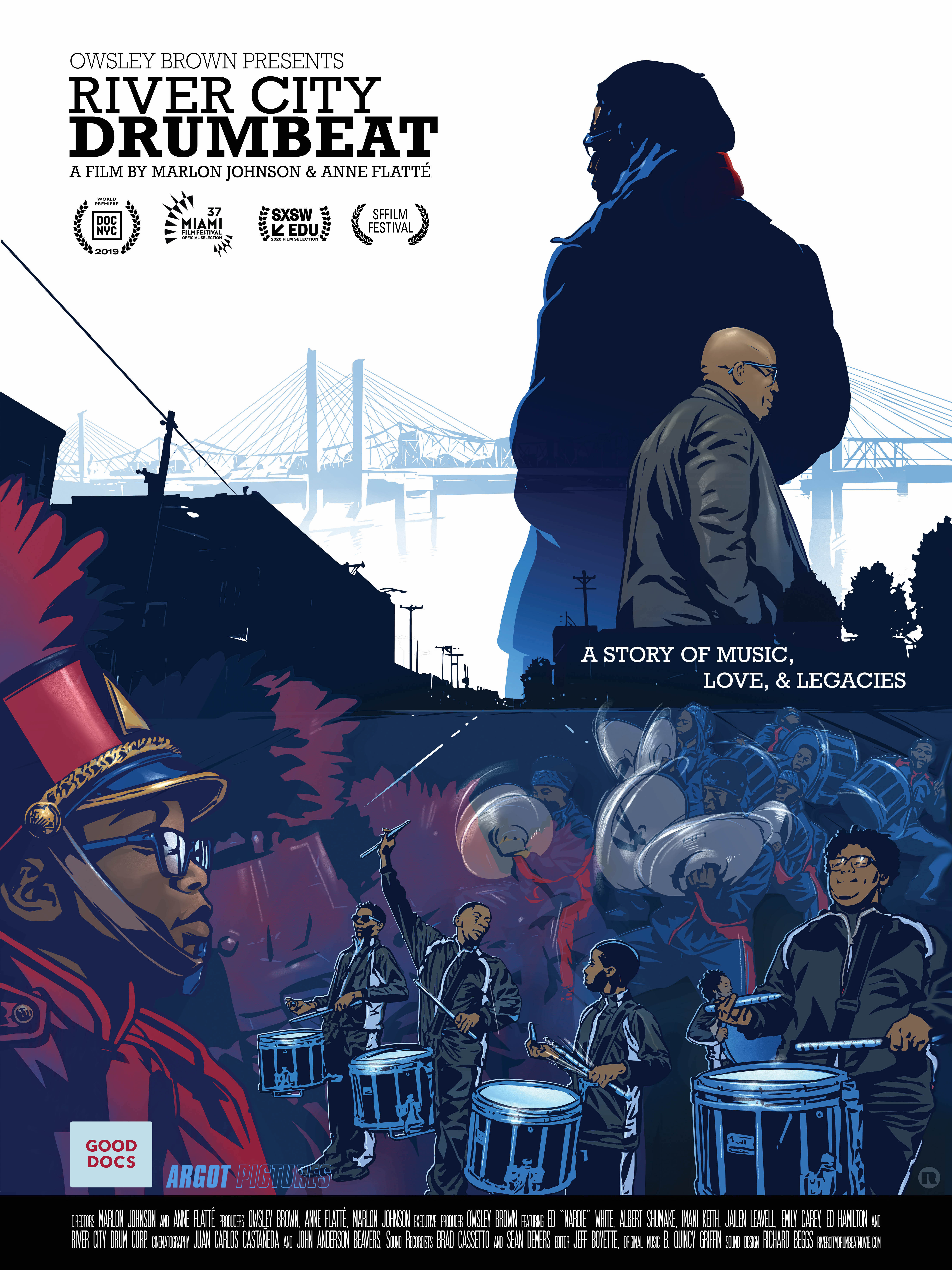 RIVER CITY DRUMBEAT is an uplifting story of music, love, and legacies set in the American South. Edward "Nardie" White devoted his life to leading the African-American drum corps he co-founded with Zambia Nkrumah in Louisville, Kentucky three decades ago. Together they inspired youth from their West Louisville neighborhood to thrive by connecting them with the art and cultural traditions of their African ancestors. Now Albert Shumake, whose destiny was shaped by the drumline, must take up the mantle for the next generation. Meanwhile, student drummers Imani, Jailen, and Emily navigate adolescence and life changes. River City Drumbeat follows this creative community of mentors, parents, and youth making their way in a world where systemic forces raise obstacles to fulfilling their dreams.